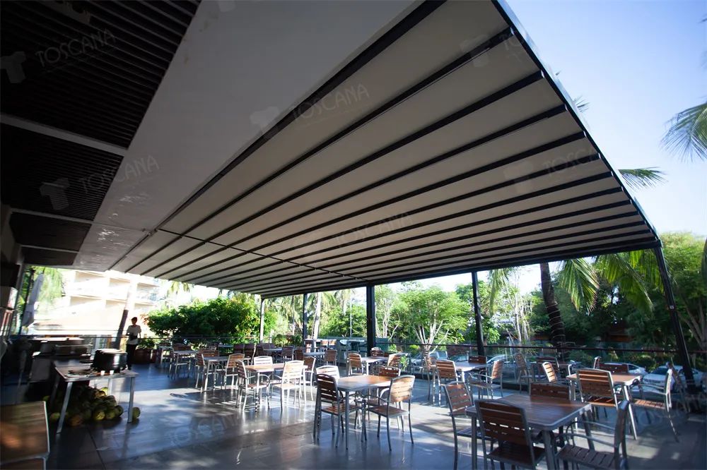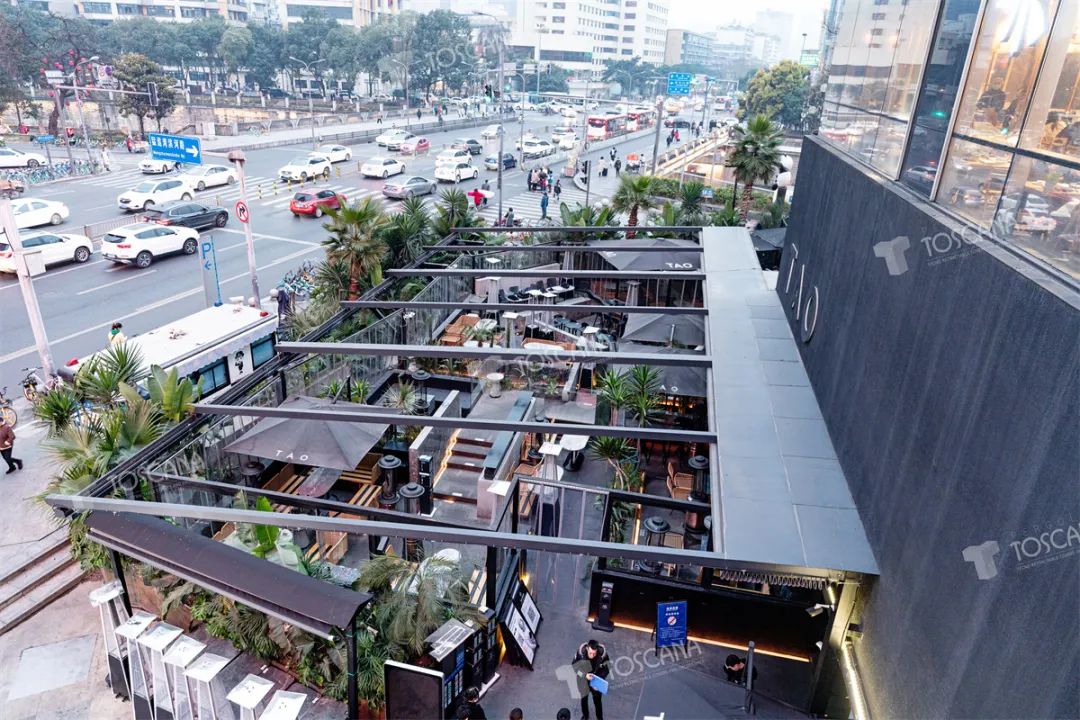 托斯卡纳新型室外电动轨道技术:打造出真正遮阳隔热、防雨防水的露天咖啡馆。