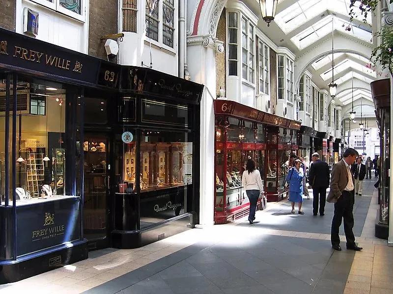 给商业街加「顶」并非新生概念,早在1819年的英国,就建造过一条设有玻璃顶棚的奢侈品购物街——伯灵顿拱廊街,它用玻璃拱顶把街道两边的的商店连接起来,给人们提供一个舒适购物环境。