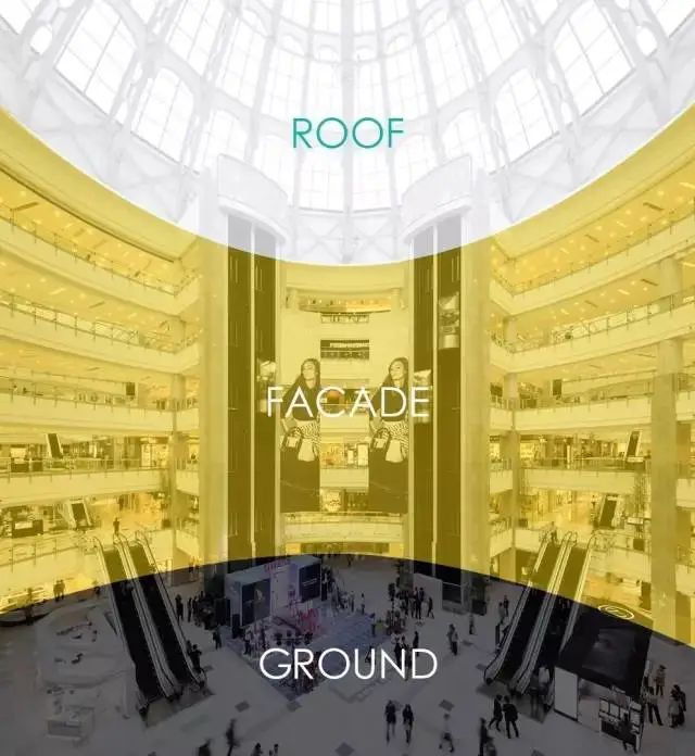 目前商业中庭分解来看,可归纳为”三面一体“四个元素:三面为屋顶面(ROOF)、商业面(FACADE)、楼地面(GROUND)。