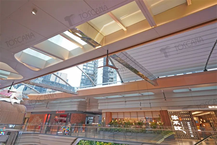 通过可自由开合的遮阳产品,将真实的室外天空引入室内视觉感知之中,将屋顶景观与商业中庭串联,就会立刻显著提高中庭的生动程度,这也是通过托斯卡纳产品搭建的中庭空间的出色亮点。