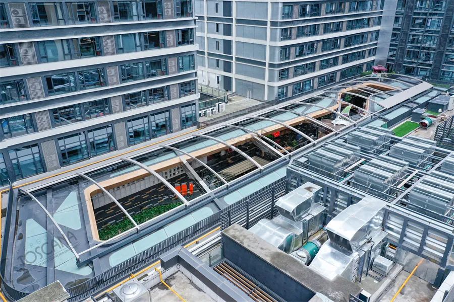 在TOSCANA所打造的全新商业中庭空间下,可随着阳光灵活调节篷顶开合状态或光线角度,任意切换空间场景,保持空间处于舒适的温度状态,带来不错的节能增益。