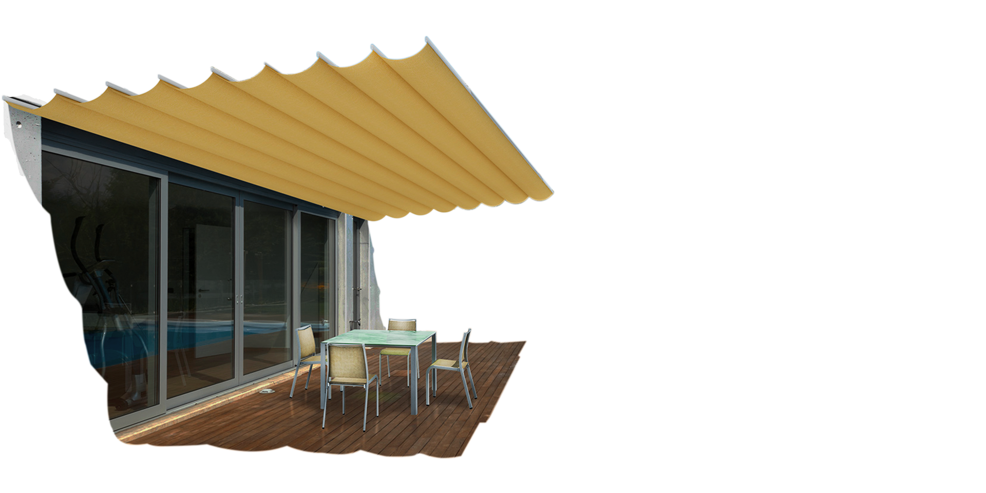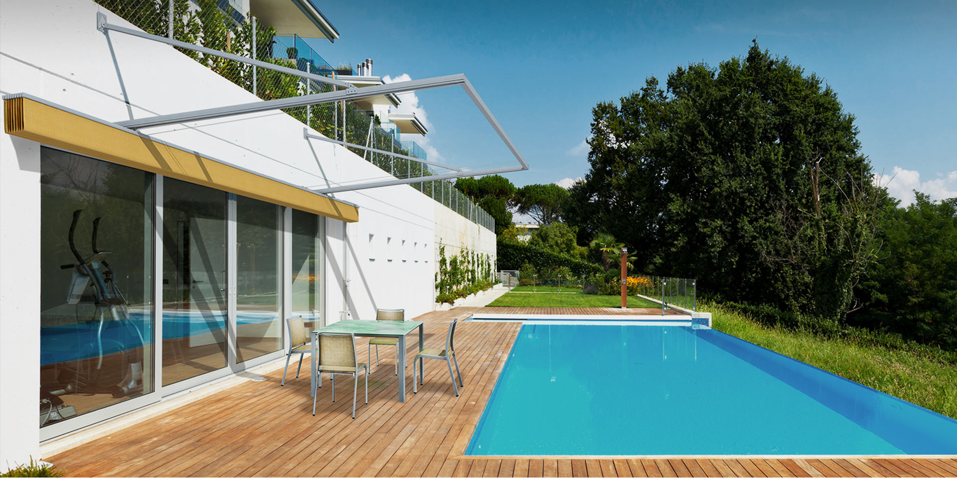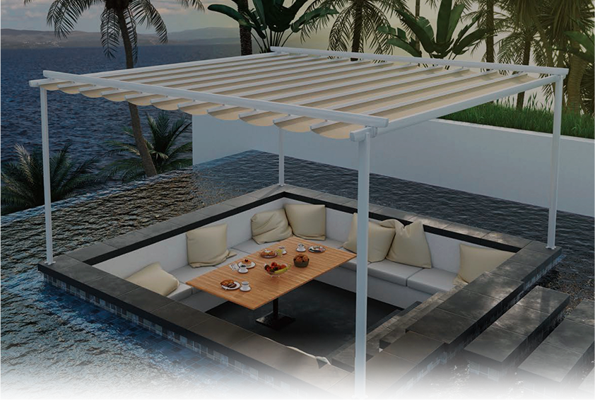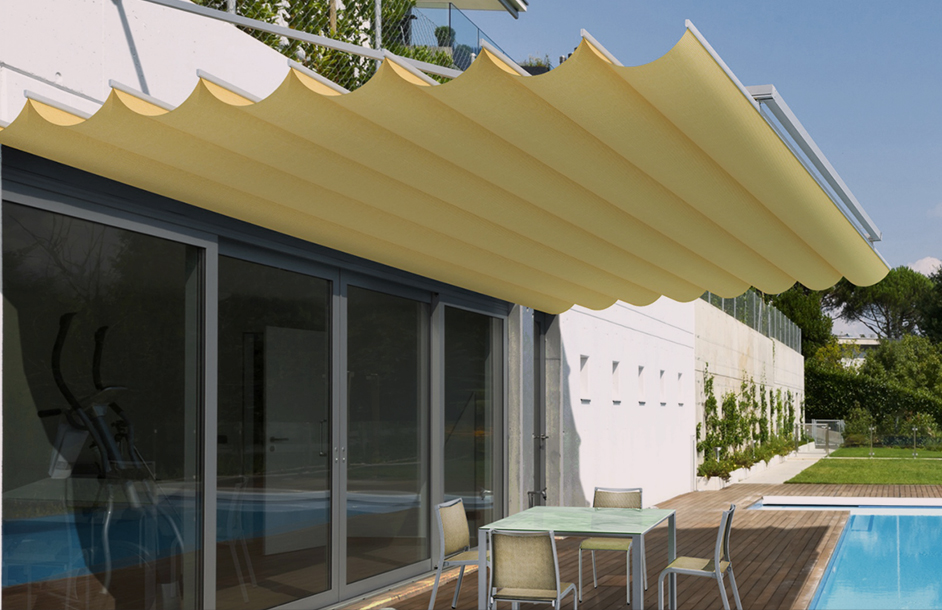 TOSCANA(托斯卡纳)室外电动遮阳天篷帘是一款由轨道系统与帘布相结合,以遮挡阳光为主的遮阳篷,其设计理念源自于意大利托斯卡纳的艳阳文化,融合了新一代室外遮阳技术,让其更好地融入现代别墅住宅的室外休闲环境中。