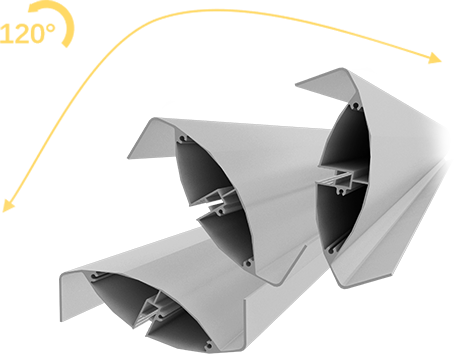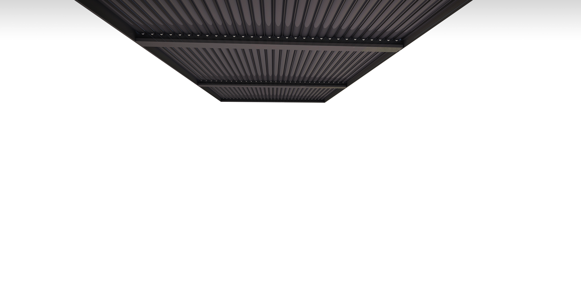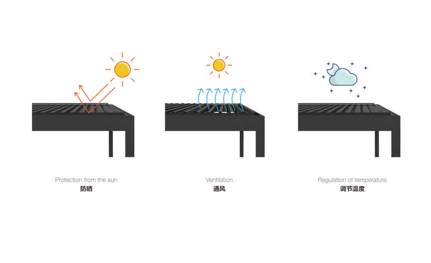 顶面由可翻转的全铝合金百叶系统组成航空级铝合金材质。双层中空结构散热更快,强度更高