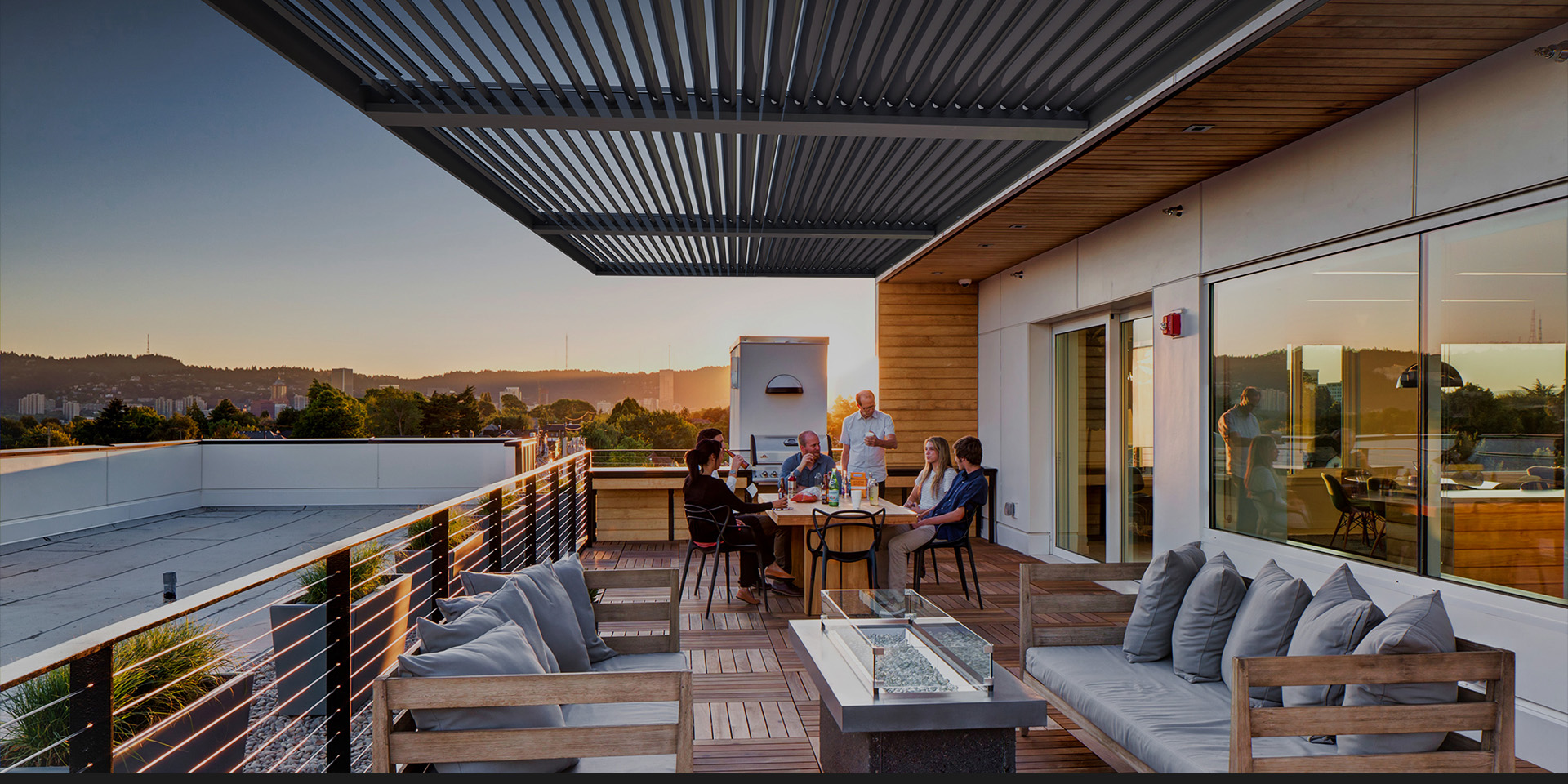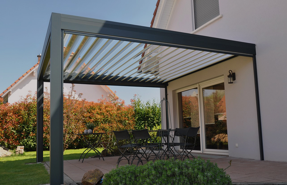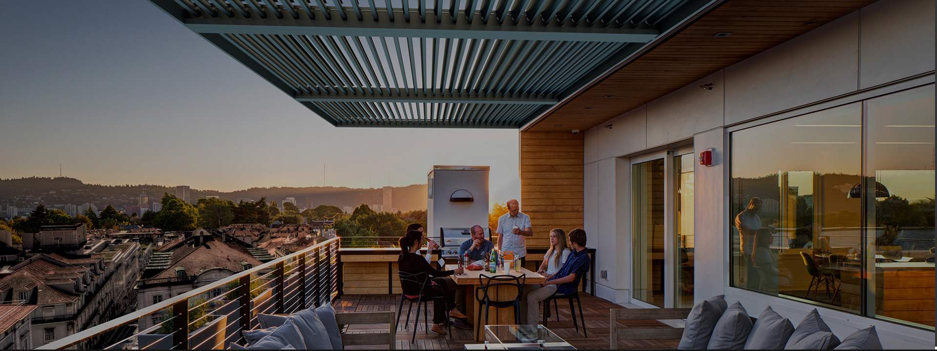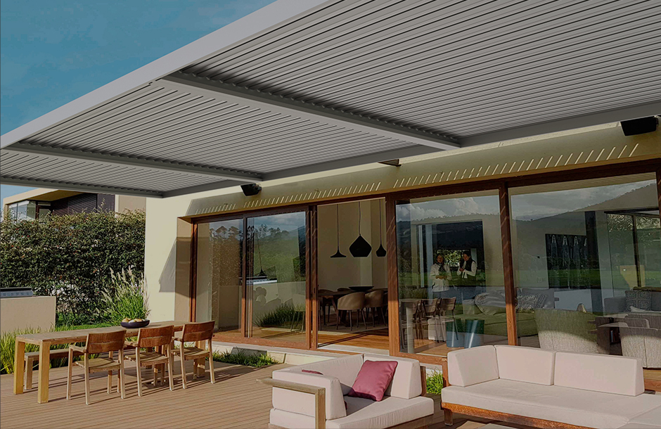 TOSCANA(托斯卡纳)室外电动翻转百叶篷基于国际领先的“Pergolas技术”,将独特的中空式梭形叶片与建筑美学融为一体,使得叶板闭合后,能够完全阻隔光线和雨水进入,并能抵御100km/h的大风环境,最大程度减少外部天气对遮阳空间的干扰。
