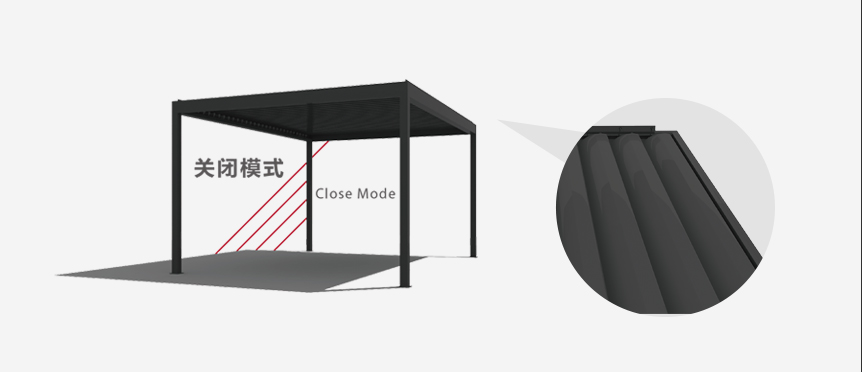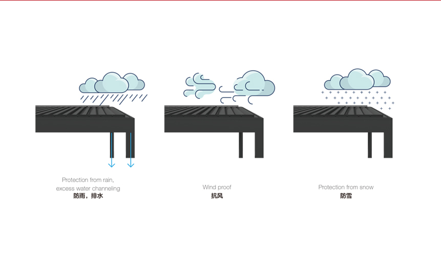 智能生态篷拥有良好的隐藏式排水系统。雨天情况下,雨水通过百叶分流到内部的水槽,再通过水槽导流,引导积水进入立柱。