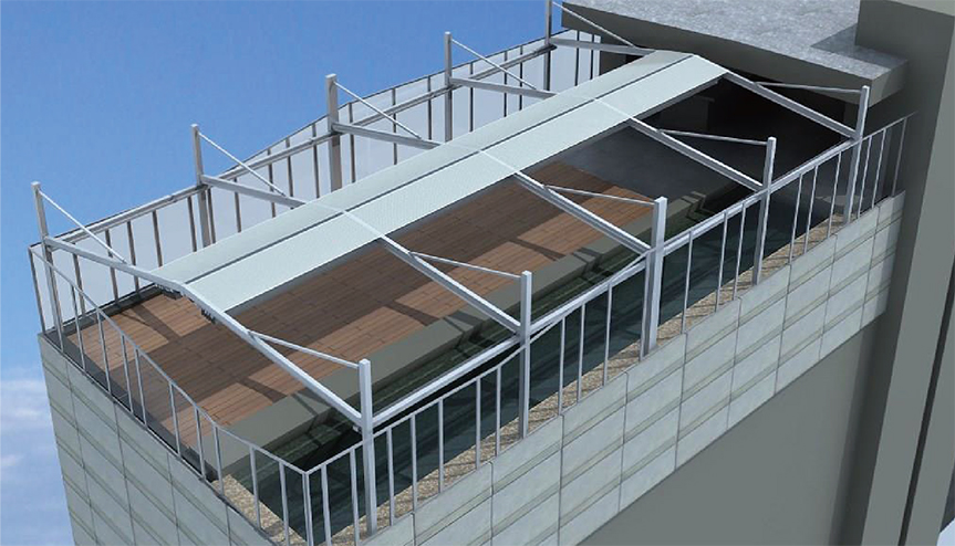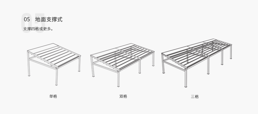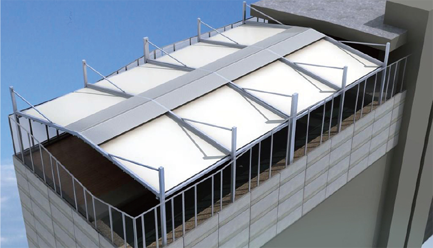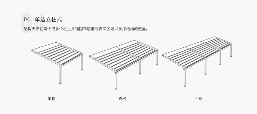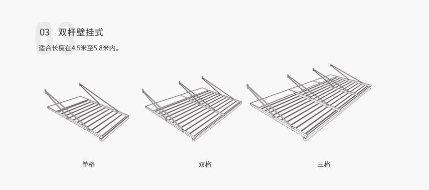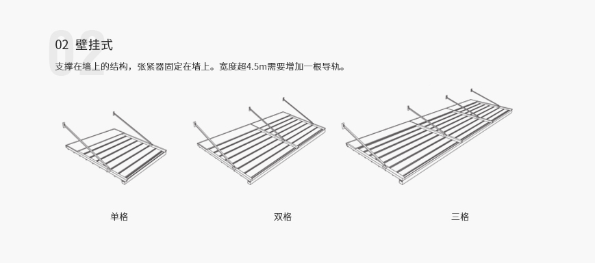 单套产品宽度可长达13.5m,单边外飘伸展达11m(双边22m,中间无立柱),能承受50~70km/h的风力,是目前国内首家也是唯一具备大型室外电动遮阳产品。